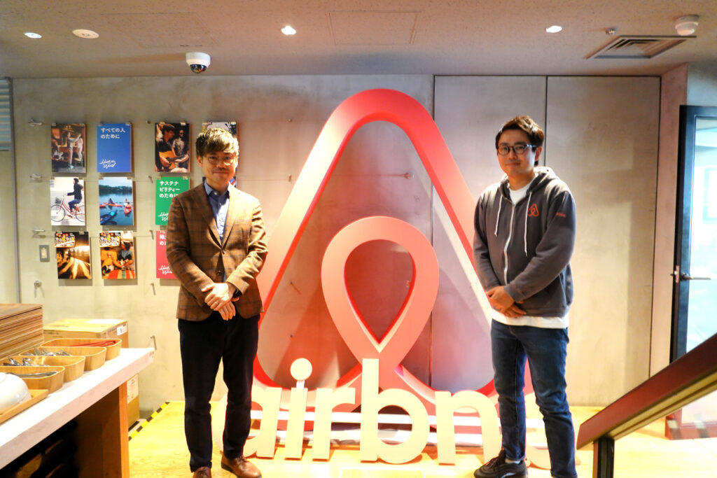 Airbnb Japan本社にて、ホームシェアリング事業統括本部の井上氏(右)と代表の大﨑(左)。