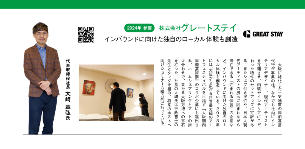弊社は2024年11月に、大阪に特化して10年目を迎えた民泊の運営・管理会社としての実績が認められ、Airbnb Partnersに正式に参画し、Airbnb公認の運営・管理会社となりました。airbnb patners booklet(写真下)内でも、『関西からはじまるホームシェアリング次の大舞台』と、関西万博と絡めて大々的に弊社が取り上げられています。